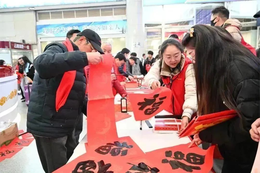 中工網(wǎng)訊 據(jù)云南省總工會(huì)微信公眾號(hào)消息,1月26日,春運(yùn)開始的第一天,昆明火車站候車廳內(nèi)喜氣洋洋、年味濃郁,云南省總工會(huì)開展2024年“送萬(wàn)福 進(jìn)萬(wàn)家”書法公益志愿服務(wù)活動(dòng),為職工群眾送上新年祝福。