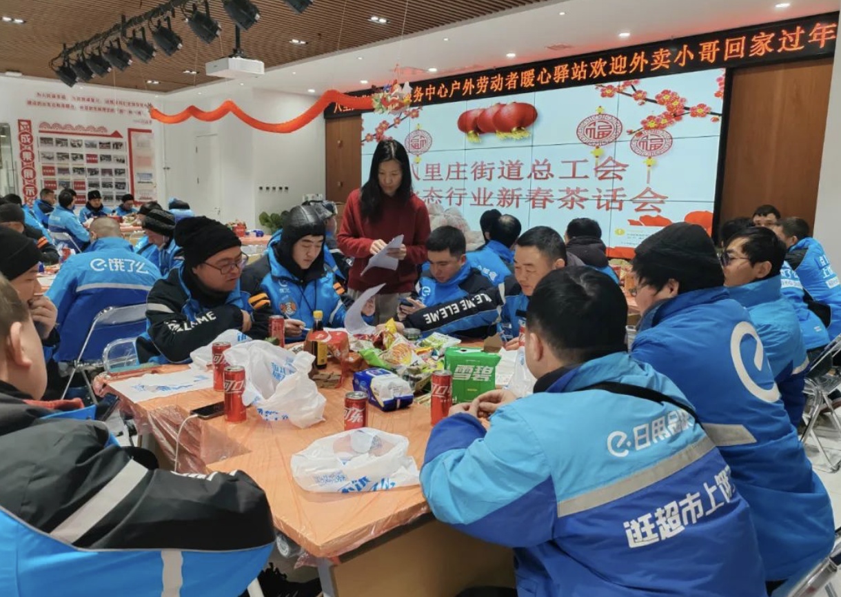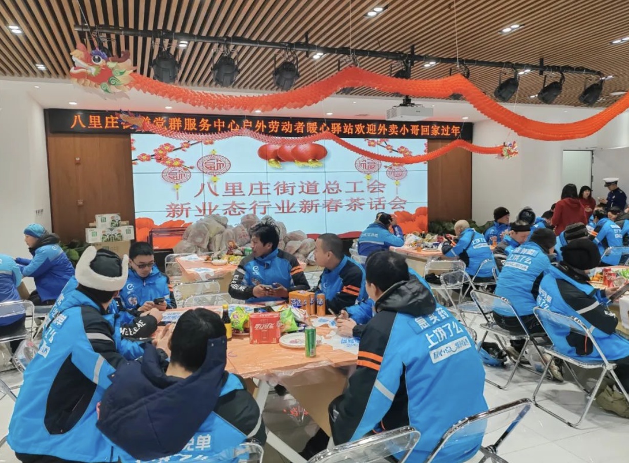 2月9日,農歷甲辰龍年新春佳節之際,北京八里莊街道總工會邀請轄區節日里依然堅守在工作崗位上的外賣騎手,在北京市朝陽區八里莊街道黨群服務中心戶外勞動者暖心驛站歡歡喜喜過大年。這是北京工會過年期間驛站“不打烊”,持續服務職工的一個剪影。