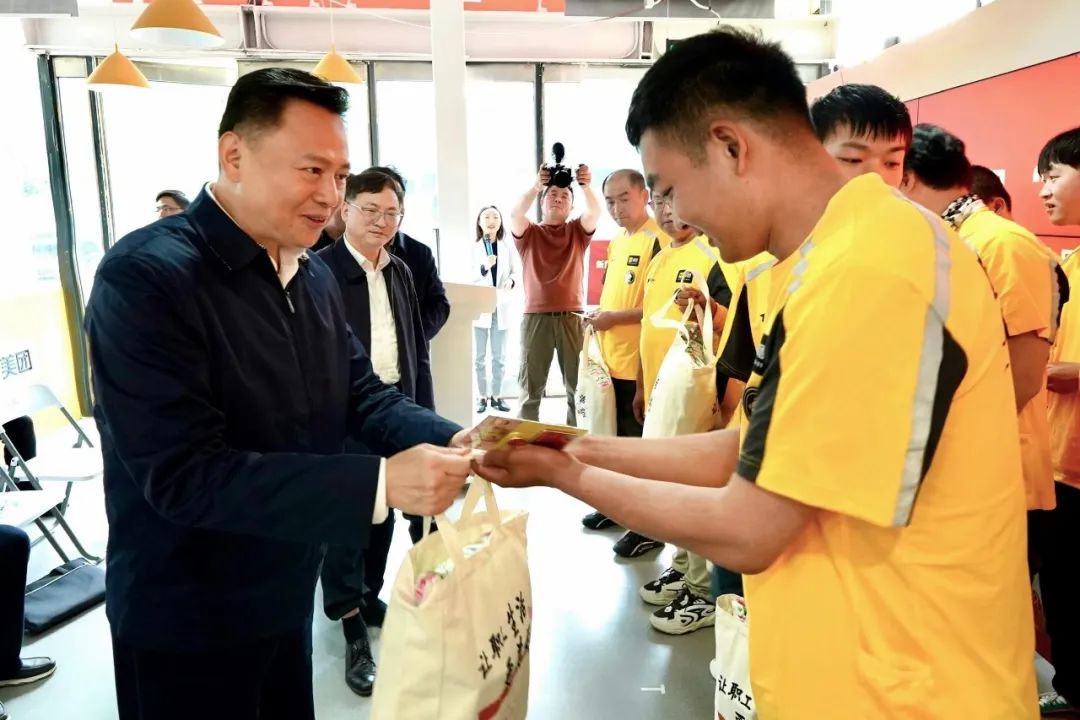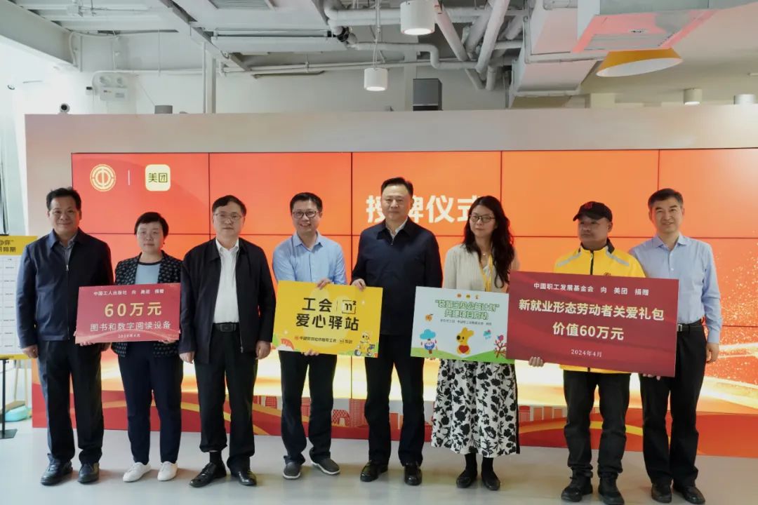 徐留平一行向榮獲全國五一勞動獎章的外賣騎手贈送慰問金,為“1平米”工會驛站、全總文工團與美團共建袋鼠寶貝之家合唱團公益項目、中國工人出版社與美團共建職工書屋項目揭牌,并向美團贈送中國職工發展基金會“新就業形態勞動者關愛禮包”。