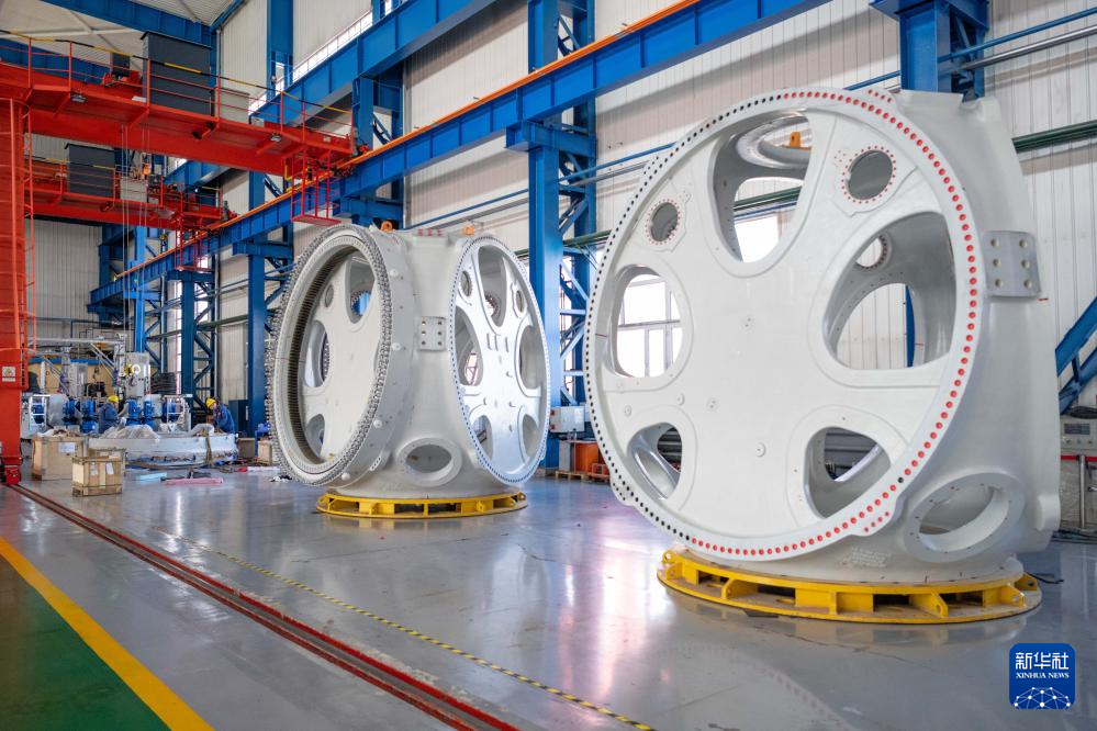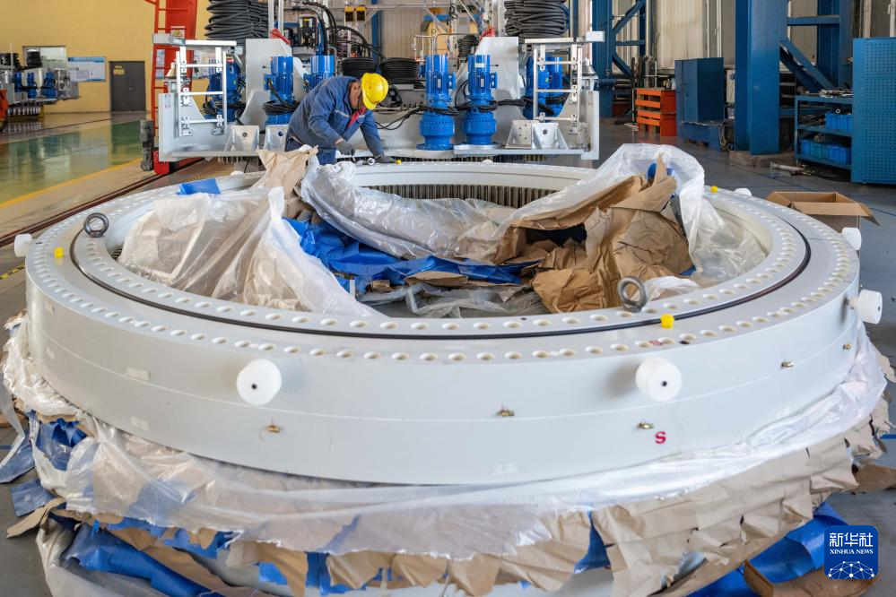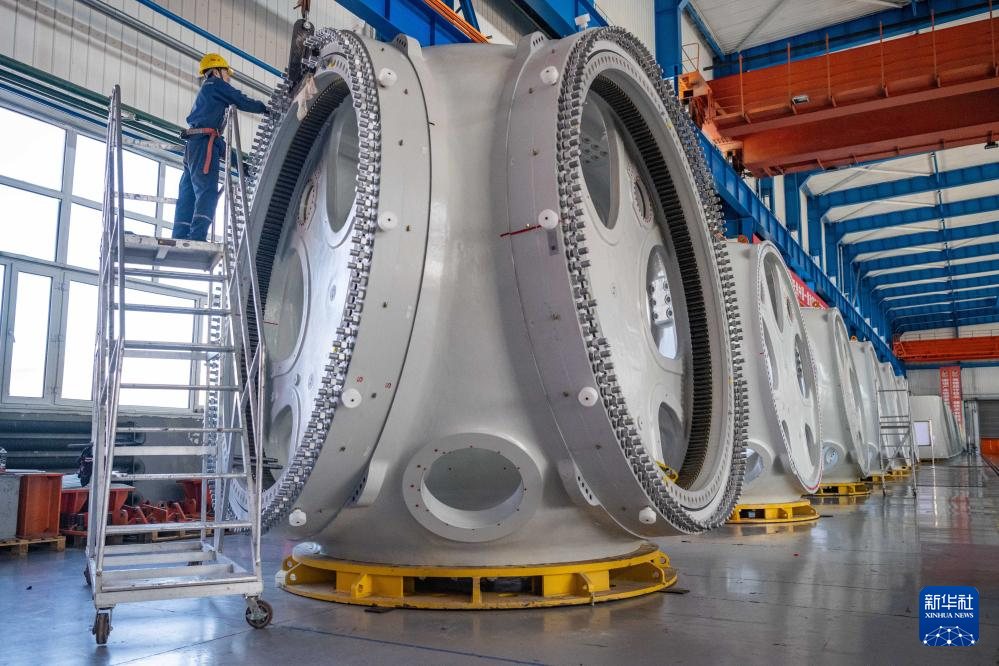 4月28日,在位于黑龍江省齊齊哈爾市的中國一重集團有限公司,工作人員在風電設備裝配車間內加工風電輪轂。新華社記者 謝劍飛 攝