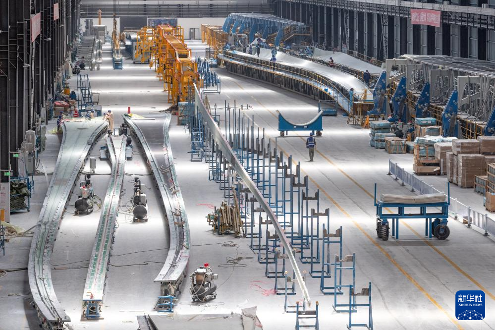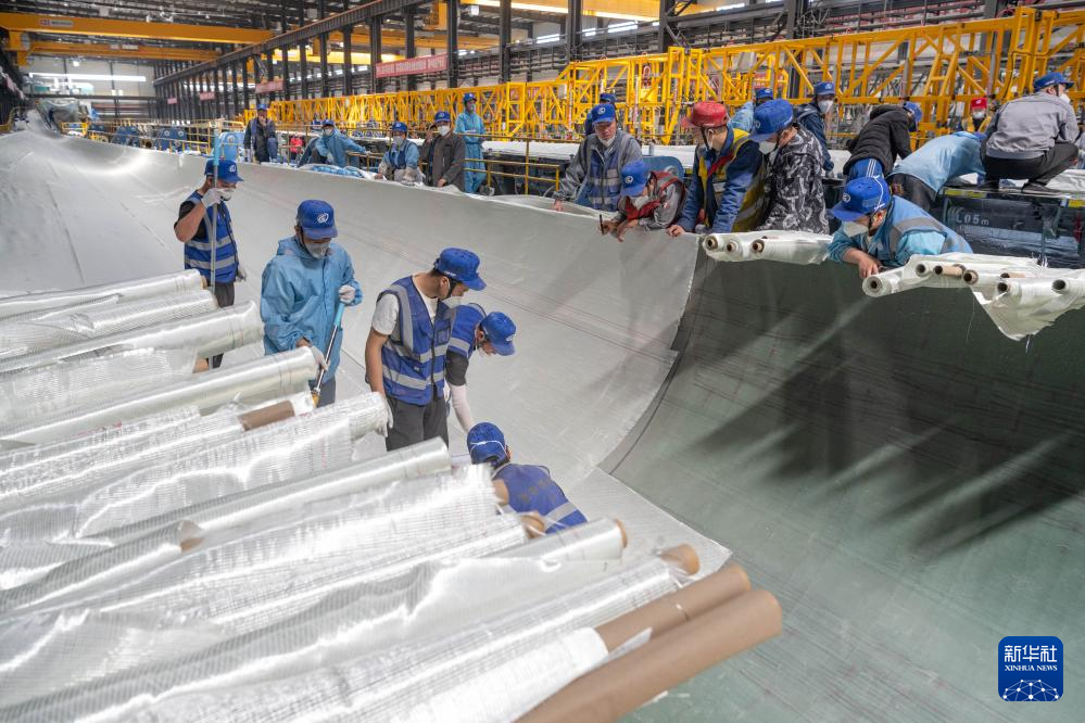 4月28日,在一重龍申(齊齊哈爾)復合材料有限公司,工作人員在廠區進行風電葉片生產作業。新華社記者 謝劍飛 攝