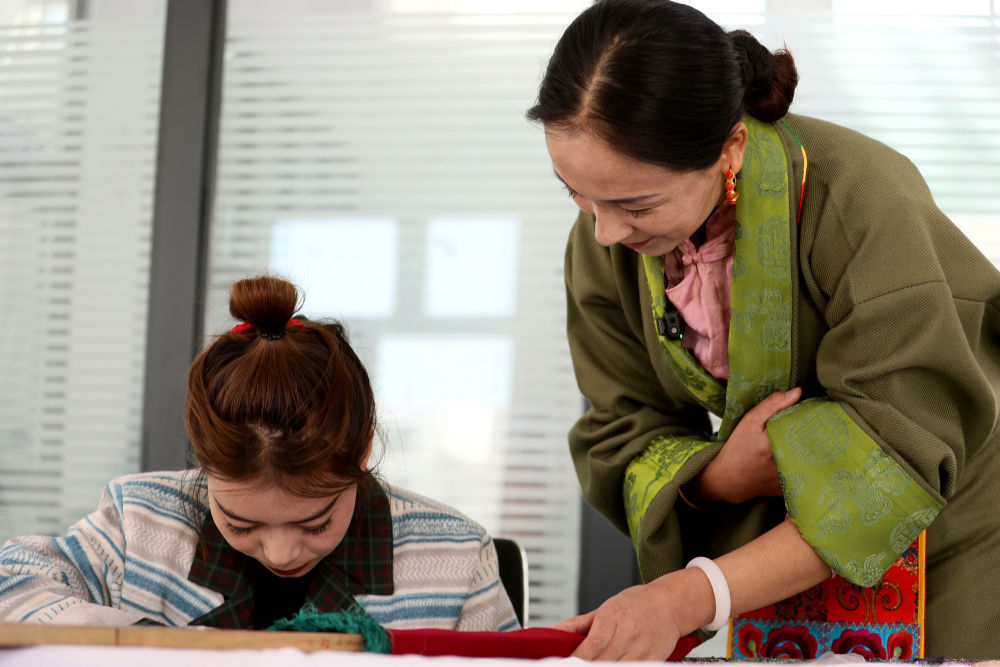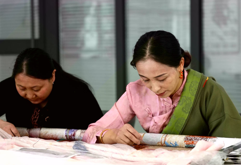 4月23日,拉毛葉忠(右)在指導繡娘制作藏繡作品。新華社記者 王艷 攝