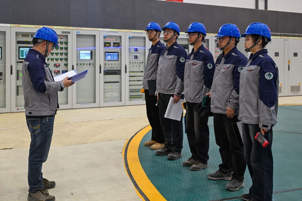 4月23日,在國(guó)網(wǎng)新源新疆阜康抽水蓄能電站地下廠房,工作結(jié)束后工作人員在現(xiàn)場(chǎng)進(jìn)行檢修交代。新華社記者 陳朔 攝