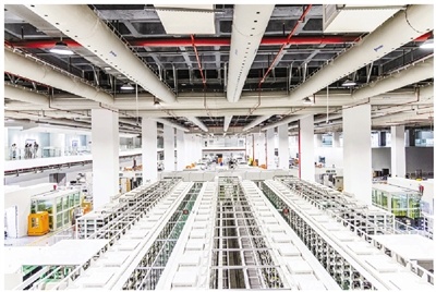 新華三未來(lái)工廠一角。這個(gè)智能工廠集合了5G、AI、邊緣計(jì)算、工業(yè)互聯(lián)網(wǎng)等前沿?cái)?shù)字技術(shù),是新華三集團(tuán)在智造領(lǐng)域的實(shí)踐樣板。
