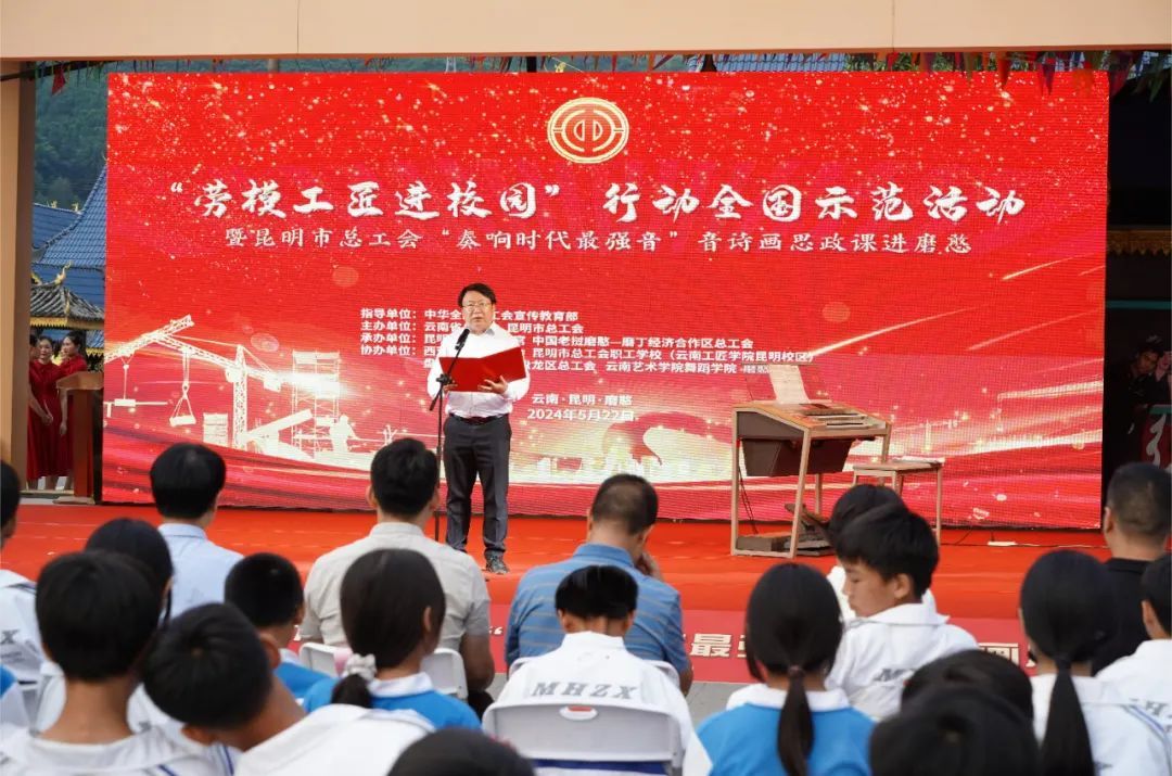 5月22日,“勞模工匠進(jìn)校園”行動(dòng)全國(guó)示范活動(dòng)暨昆明市總工會(huì)“奏響時(shí)代最強(qiáng)音”音詩(shī)畫(huà)思政課進(jìn)磨憨活動(dòng)在磨憨—磨丁合作區(qū)尚崗村活動(dòng)廣場(chǎng)舉行。云南省總工會(huì)副主席馬健出席活動(dòng)并致辭。昆明市總工會(huì)黨組副書(shū)記、常務(wù)副主席候選人朱滔,磨憨—磨丁合作區(qū)黨工委委員、管委會(huì)副主任傅科杰等人以及磨憨—磨丁中心學(xué)校學(xué)生代表,職工代表參加活動(dòng)。