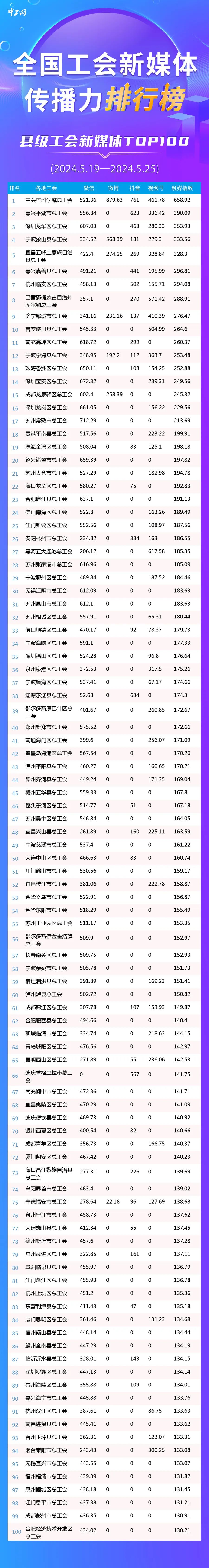 新一期全國縣級工會新媒體傳播力TOP100發布: