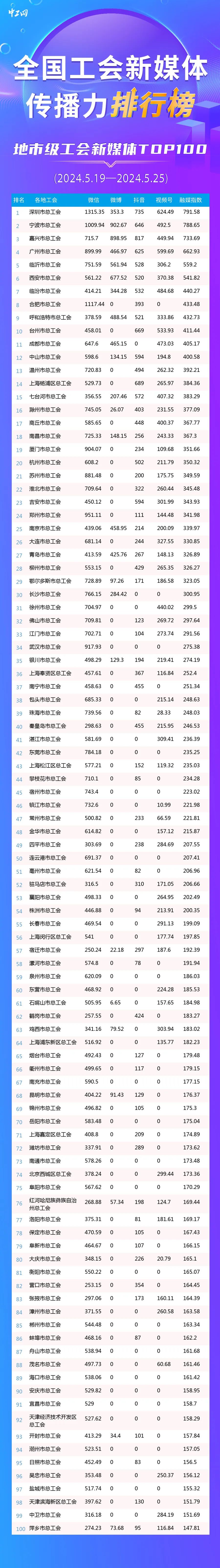 新一期全國地市級工會新媒體傳播力TOP100發布: