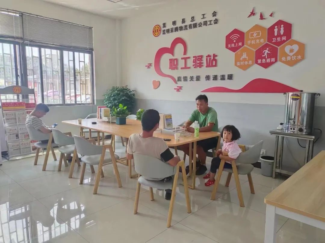在嵩明采騰物流停車場打造路途中的24小時“溫馨港灣”工會驛站,讓司機們渴了累了可以隨時“剎一腳”。