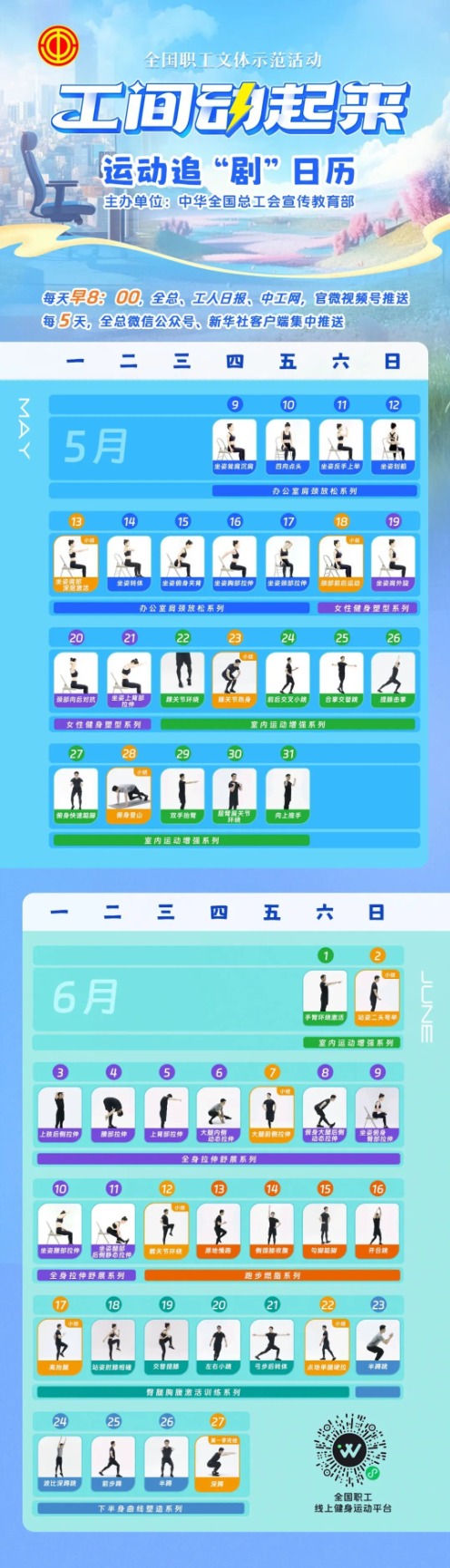 全國總工會宣教部近期上線“工間動起來”——職工健身短視頻,供廣大職工工間鍛煉使用,包括肩頸放松、健身塑型、全身拉伸、跑步燃脂等七個系列。