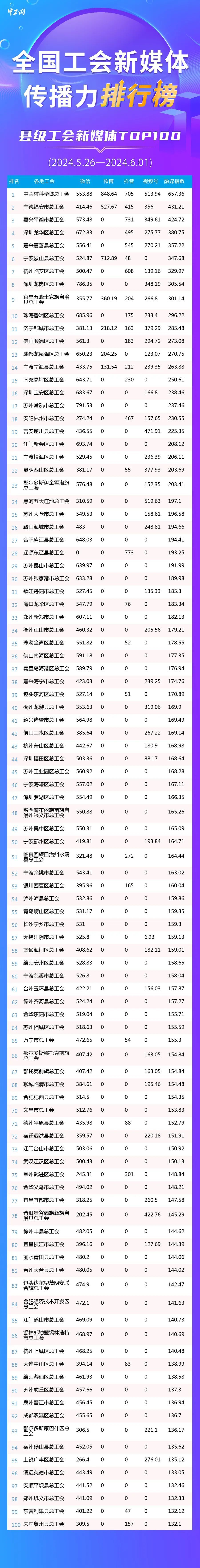 新一期全國縣級工會新媒體傳播力TOP100發布: