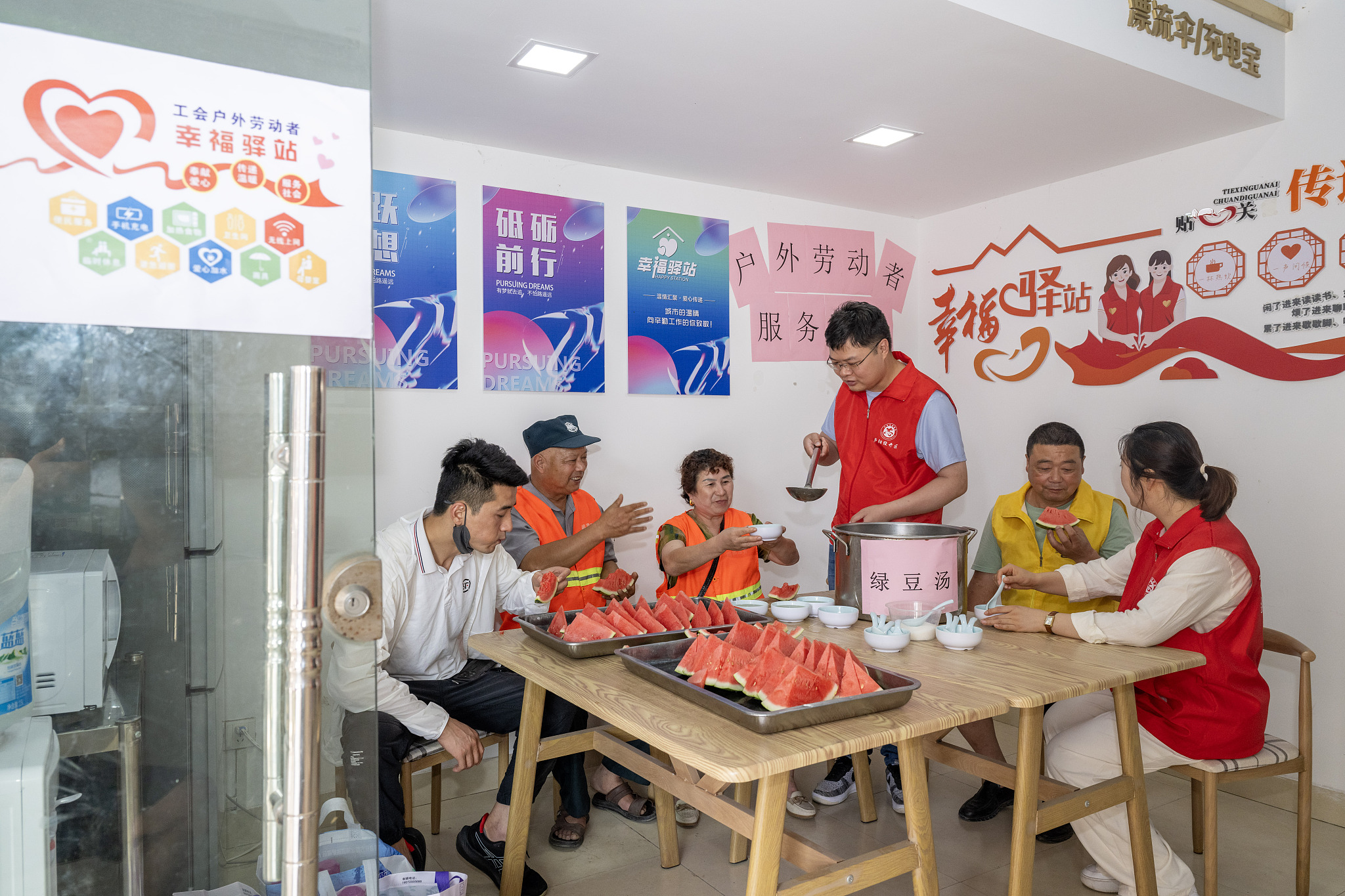 連日來,安徽省合肥市持續高溫。廬陽區設立的140個工會驛站,給戶外勞動者提供休憩場所,并免費提供綠豆湯、涼茶、西瓜、應急藥品等防暑降溫物品。(圖片來源:視覺中國)