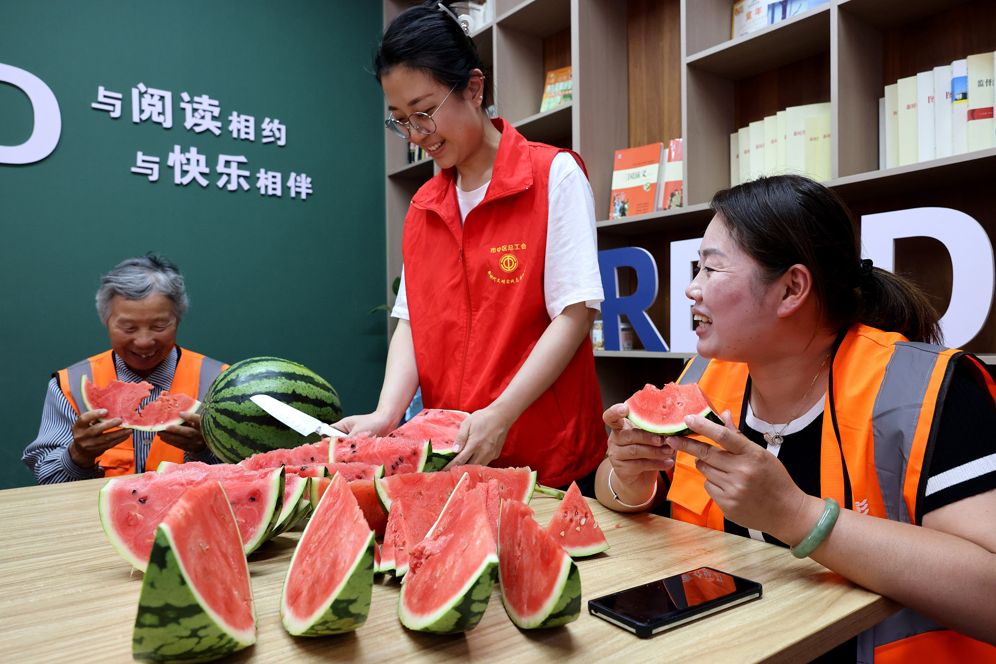 6月11日,在市中區總工會設立的“愛心驛站”內,工會志愿者(中)為前來休憩的環衛工人切西瓜。