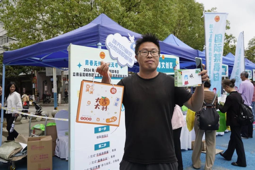 “真的是太有新意啦,通過一張小小的明信片就把禁毒知識競賽和趣味游戲串聯起來,互動性強,禁毒知識也牢記于心!”禁毒游戲互動區,參與游戲互動的職工群眾紛紛點贊這個活動創意。在這里,職工群眾通過領取一張禁毒主題明信片,參與禁毒知識競賽的同時抽取獎品可獲得一枚印章,參與“重拳出擊”,對毒品說“不”可獲得一枚印章,用水彩筆在手繪涂鴉墻上繪畫可獲得一枚印章,集齊三枚印章的職工群眾可以在明信片上寫下自己的話,在五種類型的郵票中選擇一枚自己喜歡的,通過親手粘貼,最終獲得這張充滿紀念意義的明信片,可以選擇寄出,也可以選擇自己收藏。完成這一系列動作,這張小小的禁毒主題明信片也剛好完成自己的“使命”。