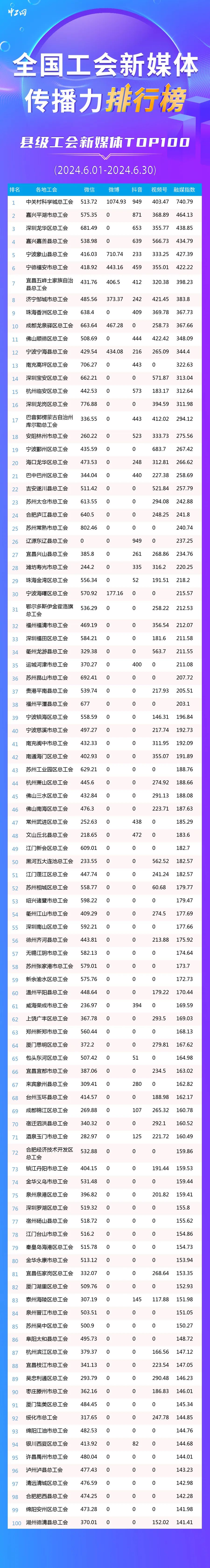 6月全國(guó)縣級(jí)工會(huì)新媒體傳播力TOP100發(fā)布: