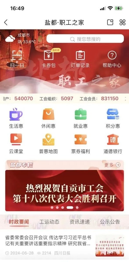四川省總將工會(huì)數(shù)字化建設(shè)作為工會(huì)改革創(chuàng)新的重要抓手,持續(xù)整合工會(huì)資源、再造業(yè)務(wù)流程,著力打造集思想引領(lǐng)、業(yè)務(wù)辦理、工會(huì)服務(wù)、工會(huì)活動(dòng)、內(nèi)部辦公于一體的四川省工會(huì)網(wǎng)上工作平臺(tái)(川工之家APP),切實(shí)走好網(wǎng)上群眾路線。截至目前,平臺(tái)注冊(cè)用戶已達(dá)900余萬人,累計(jì)辦理入會(huì)轉(zhuǎn)會(huì)等工會(huì)業(yè)務(wù)470余萬件次,信息總閱讀量超4.4億次,日均活躍用戶超50萬,初步構(gòu)建了基礎(chǔ)數(shù)據(jù)全省統(tǒng)一、基本業(yè)務(wù)全省通辦、普惠服務(wù)全省共享的工會(huì)網(wǎng)上聯(lián)系服務(wù)職工工作體系,連續(xù)四年獲評(píng)全國工會(huì)省級(jí)十佳“互聯(lián)網(wǎng)+普惠服務(wù)”優(yōu)秀平臺(tái)。