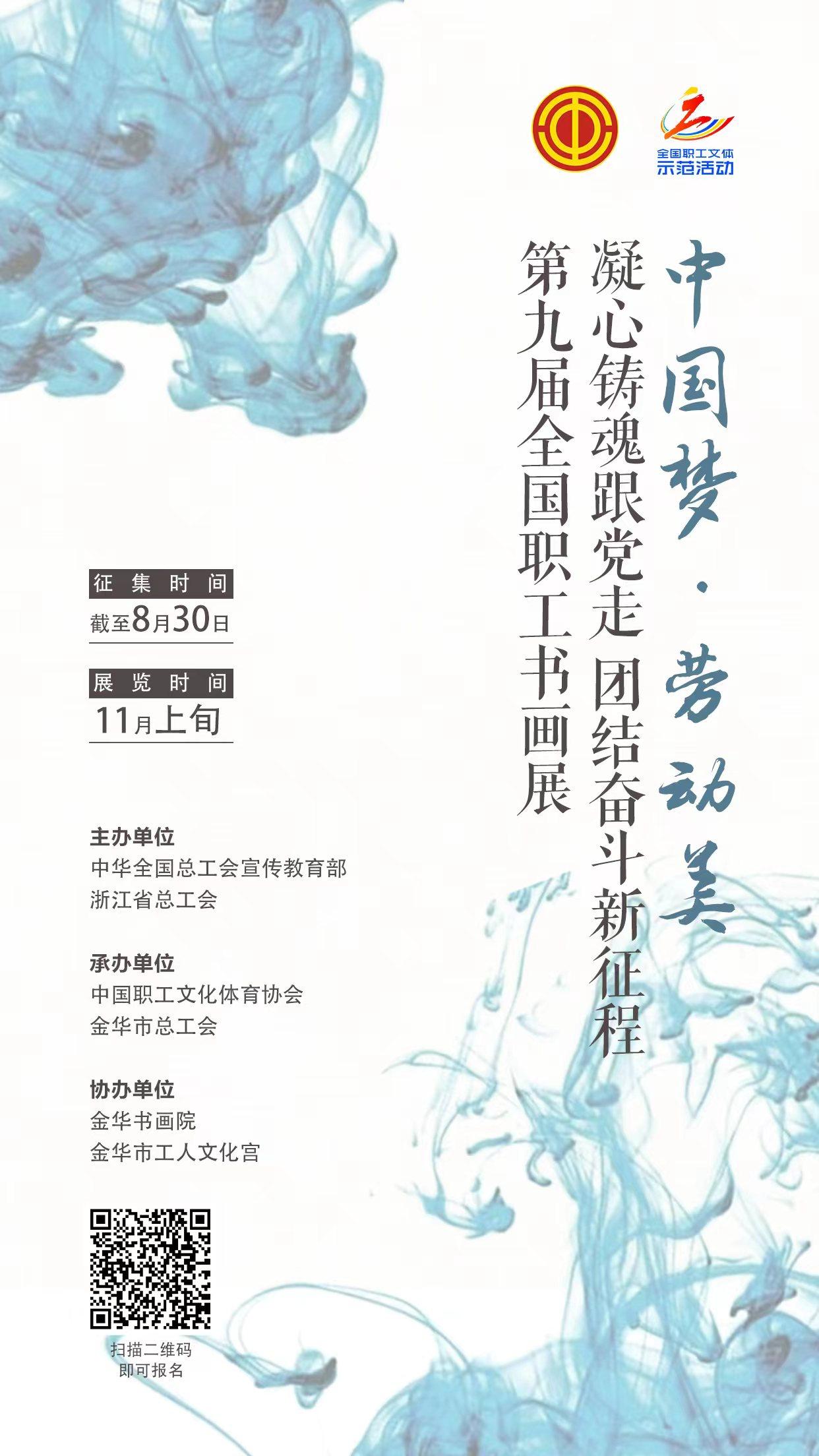中工網訊(記者 王鑫)為充分反映職工群眾高品質文化生活和美好精神追求,按照全總“559”工作部署和宣傳“1116”工作要求,全國職工文體示范活動、“中國夢·勞動美”第九屆全國職工書畫展將于今年11月在浙江省金華市舉辦,作品征集日前正式面向全國職工啟動。