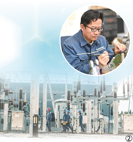 圖②:李輝(左一)帶領班組成員到變電站檢修。曹春霞 攝