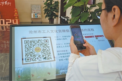 7月21日,職工在滄州市工人文化宮通過掃描微信小程序二維碼查看近期公益培訓課程安排。暴秋實攝