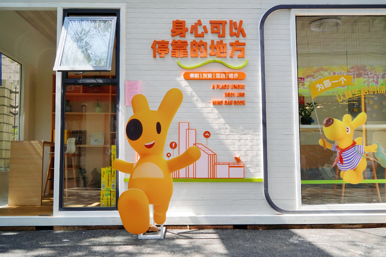 走進富春街工會驛站,記者看到,首先映入眼簾的就是大大的“工會驛站+美團‘袋鼠耳朵’”標識,整體以黃紅配色為主,打造了城市剪影、美團騎手卡通形象、美團技能卡墻等,配以“為每一個認真生活的你遮風擋雨、身心可以停靠的地方……”等溫暖標語,吸引眼球的同時又透露出溫馨。