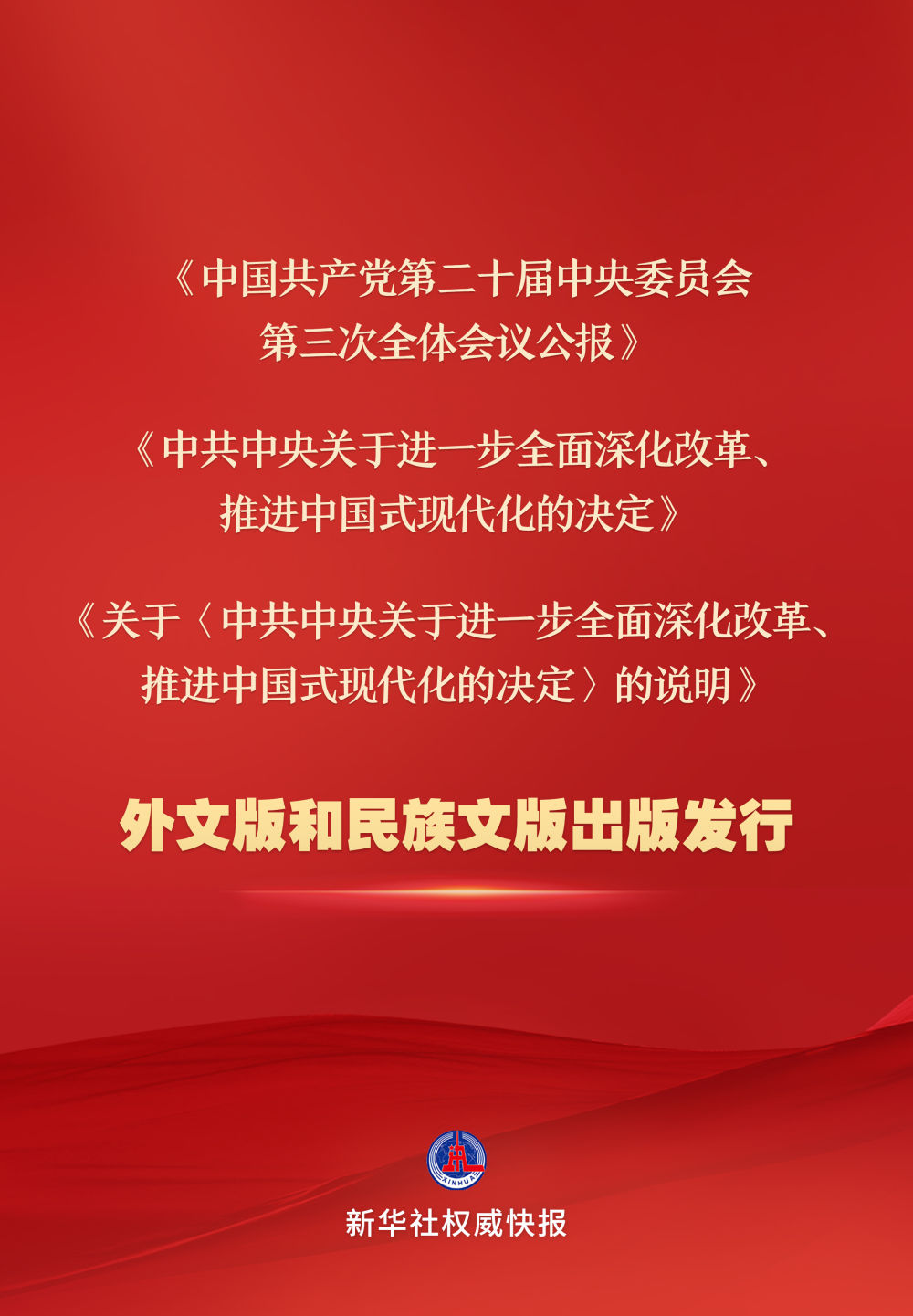 《中國共產黨第二十屆中央委員會第三次全體會議公報》《中共中央關于進一步全面深化改革、推進中國式現(xiàn)代化的決定》《關于<中共中央關于進一步全面深化改革、推進中國式現(xiàn)代化的決定>的說明》的英文、法文、西班牙文、日文、俄文、德文、阿拉伯文、葡萄牙文、越南文、老撾文等10種外文版已由中央編譯出版社、外文出版社出版,面向國內外公開發(fā)行。