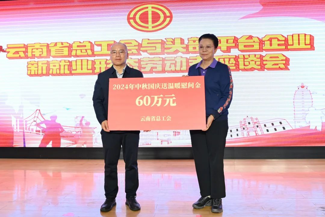 會上,王樹芬向昆明市總工會、省交通工會贈送了2024年中秋國慶送溫暖慰問金牌匾。昆明市總工會和申通、順豐、餓了么、圓通、中通、京東、貨拉拉、韻達、滴滴、美團等10家頭部平臺企業云南分支機構工會,以及2名新就業形態勞動者代表作交流發言。