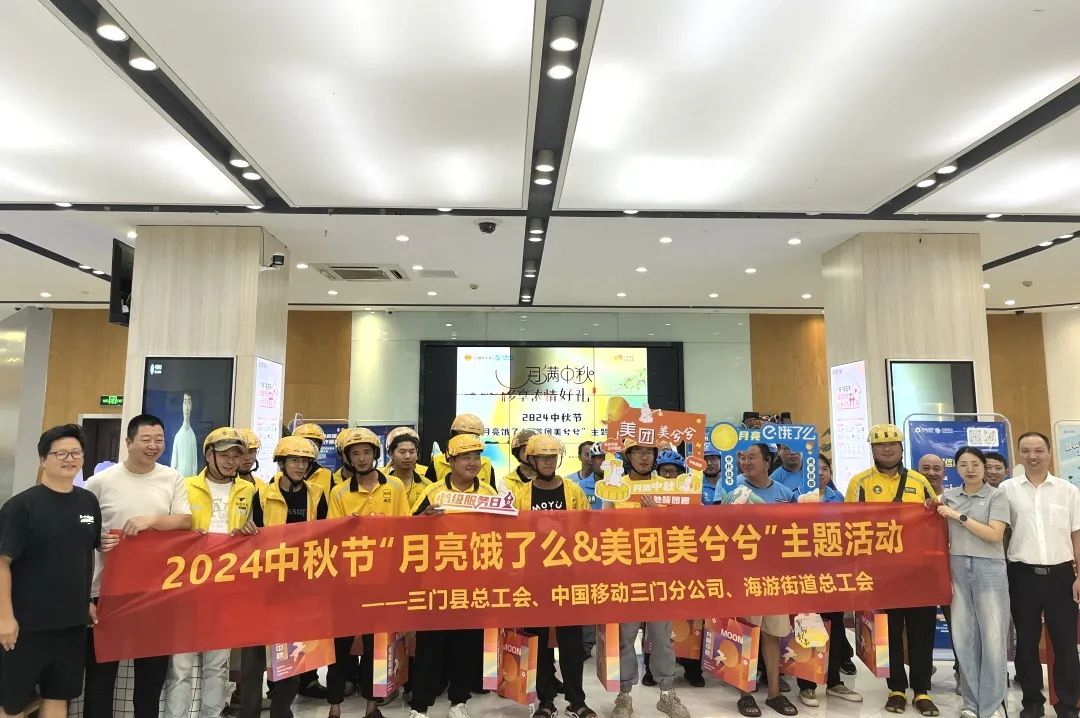 9月14日下午,三門縣總工會在中國移動三門分公司建民路營業(yè)廳工會驛站開展“月亮餓了么&美團美兮兮”中秋節(jié)主題活動,來自美團、餓了么近30名外賣小哥集聚一堂,在歡聲笑語中提前慶祝中秋佳節(jié)。