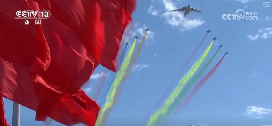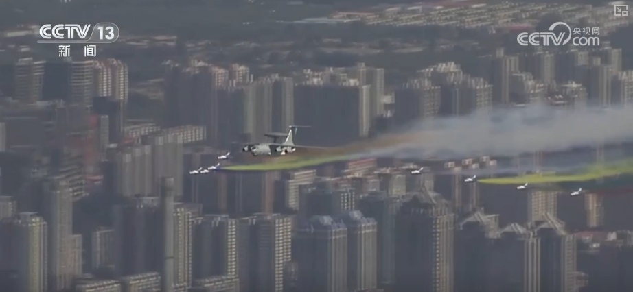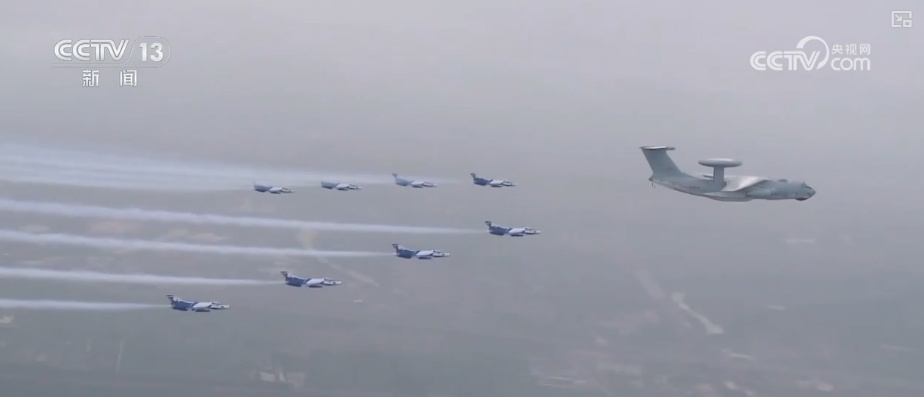 這是2009年10月1日,新中國成立60周年閱兵式上,機群飛過天安門廣場的壯觀場景。領航機型是我國自主研發的預警機空警2000和空警200,這也是中國預警機第一次在全球觀眾面前公開亮相。