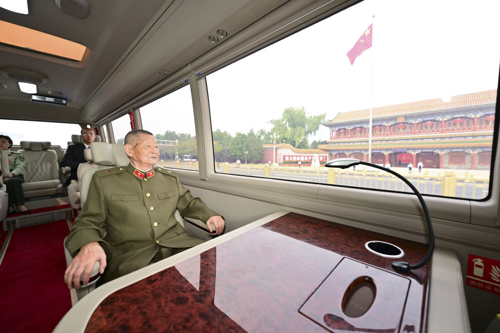 ↑9月29日,“共和國勛章”獲得者黃宗德乘坐禮賓車前往人民大會堂