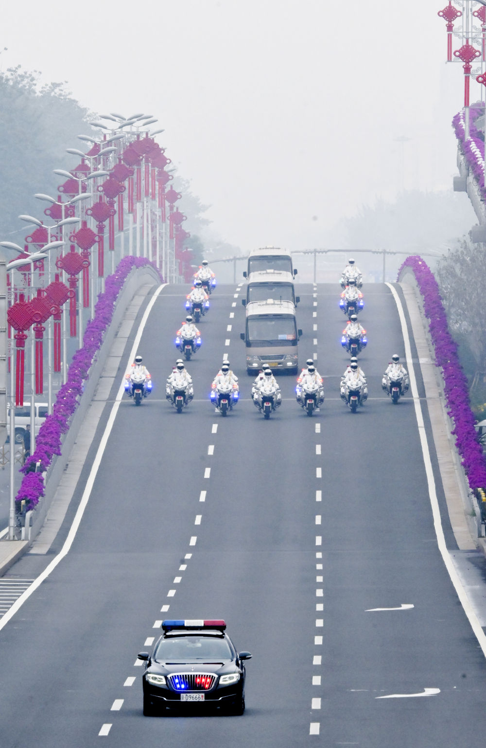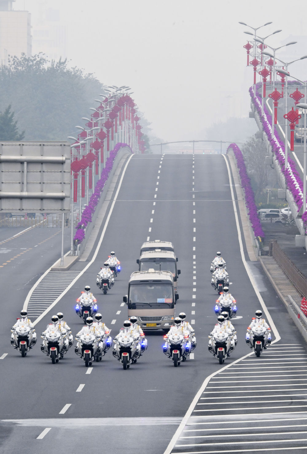 ↑9月29日,國家勛章和國家榮譽稱號獲得者集體乘坐禮賓車從住地出發,由國賓護衛隊護衛前往人民大會堂。