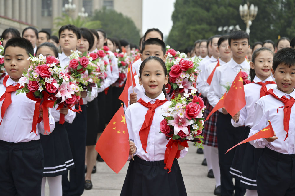 ↑9月29日,少先隊員在人民大會堂東門外廣場準備迎接國家勛章和國家榮譽稱號獲得者。