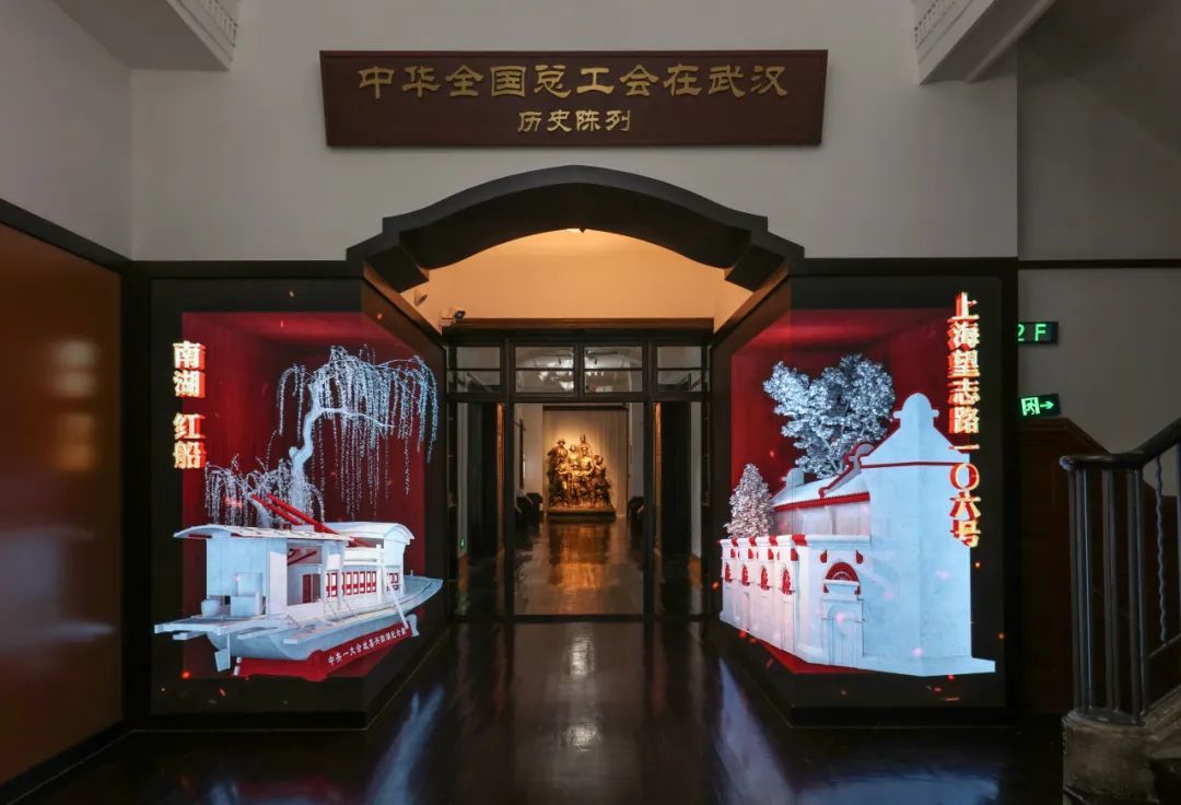 2022年11月17日,歷經三年多修繕,漢口中華全國總工會舊址紀念館再度對公眾開放。圖為“中華全國總工會在武漢”歷史陳列展廳的序廳,用虛擬與現實交錯的裸眼3D光影秀,拉開了中華百年工運史的大幕。紀念館以微縮景觀、沙畫、觸摸屏、浮雕、版畫、油畫等手法,再現大革命時期波瀾壯闊的工人運動;對24處空間進行復原陳列,大大提升了觀眾的沉浸式體驗感。