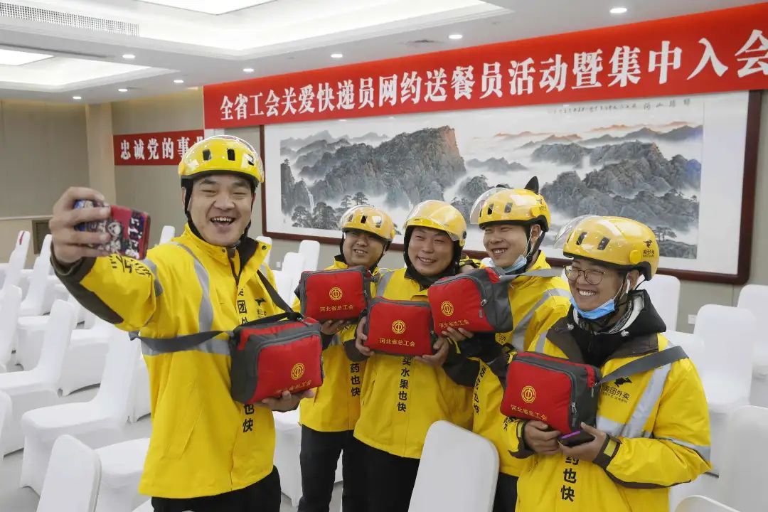 2022年10月13日,河北省總工會聯合省郵政管理局舉行全省工會關愛快遞員、網約送餐員活動暨集中入會儀式,15家快遞公司、網約送餐公司的一線代表收到了“愛心禮包”,感受到工會“大家庭”的關愛與溫暖。