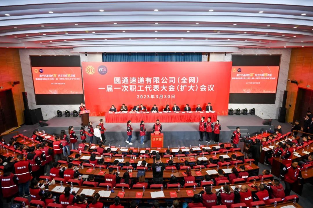 2023年3月30日,圓通速遞有限公司7個大區的180位職工代表齊聚上海總部,參加公司(全網)一屆一次職代會(擴大)會議。會議誕生了全國快遞行業首份同時覆蓋直營網點和加盟網點職工的《(全網)集體合同》,惠及45萬名勞動者。