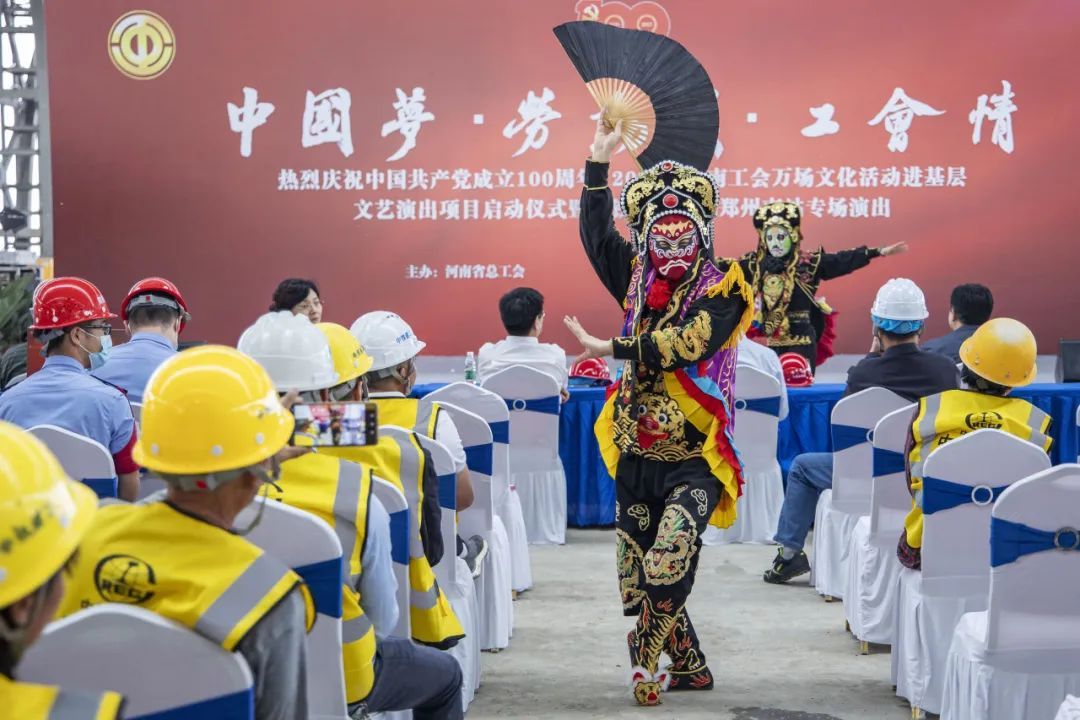 2021年5月17日,中鐵建工集團鄭州南站項目一線,“中國夢·勞動美·工會情”2021年河南工會萬場文化活動進基層活動啟動。豫劇表演藝術家、國家一級演員張海龍等為建設者們帶來精彩演出。