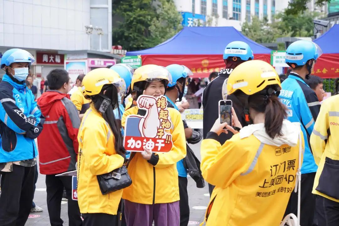 2023年7月5日,云南省昆明市新就業形態領域勞動競賽啟動儀式現場,外賣員們互相合影留念。