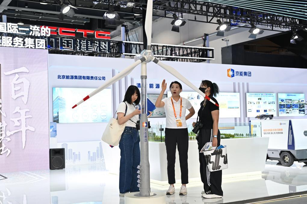 參觀者在服貿會首鋼園區京能集團展臺觀看一款新型風機模型。新華社記者 李鑫 攝