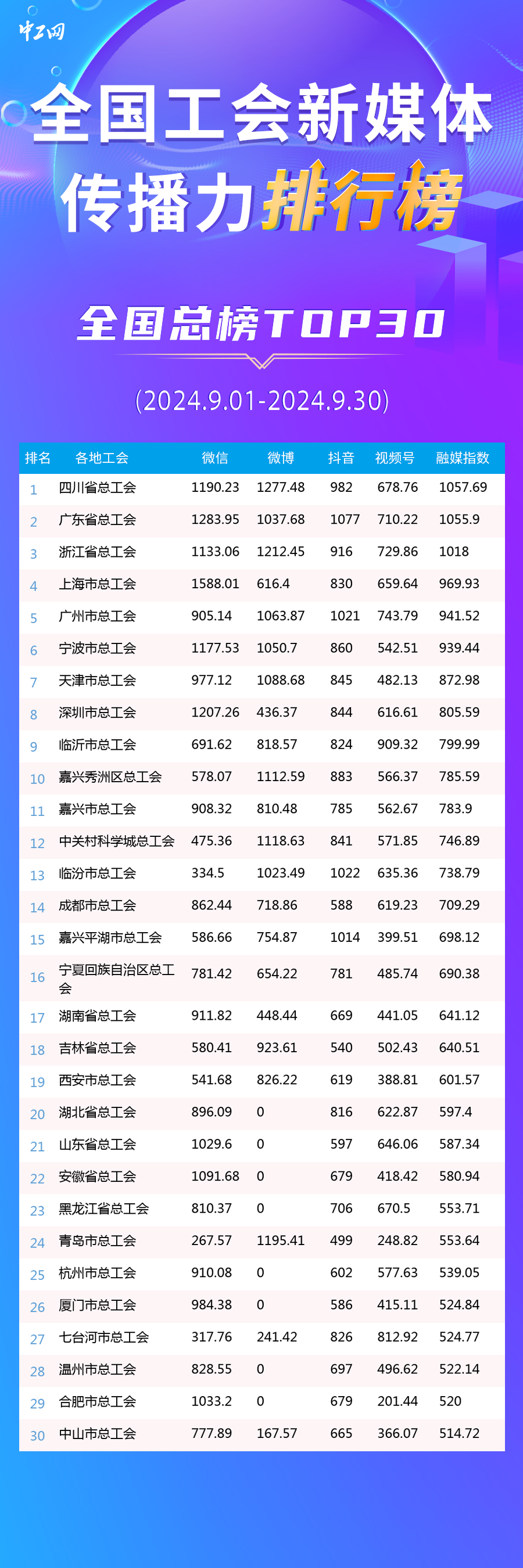 9月全國工會新媒體傳播力總榜TOP30發布: