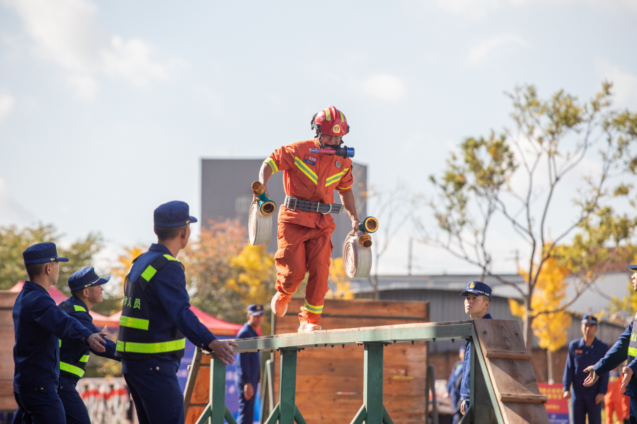 參賽隊員們嚴陣以待、精神抖擻,搜救犬指揮與服從科目犬只一令一動、人犬高度配合;無人機偵察投送科目在現場大風的情況下,無人機靈敏穿越障礙、物資拋投精準;雙輪異向切割機的鋸片以每分鐘2600的轉速輕巧打開6個擰緊的瓶蓋;消防員將登高平臺消防車云梯升起后,巧妙運用工作平臺上的長針,準確擊中距離地面18米、直徑25厘米的氣球;攀登掛鉤梯科目消防員扛著9公斤重的掛鉤梯,短短十幾秒就從1樓攀登上了4樓,動作行云流水;救援技能科目消防員利用繩索快速攀上4樓又快速下降至1樓,之后熟練操作無齒鋸,對燈泡上方3毫米的鐵絲進行毫米級誤差的精準切割,緊接著再操作15公斤重的液壓擴張器,迅速移動玻璃瓶并將一個個乒乓球平穩地置于2厘米直徑的玻璃瓶口,一系列操作沒有任何失誤,精湛的技術贏得了現場觀摩人員的熱烈掌聲,展現了消防救援人員高超的業務技能。