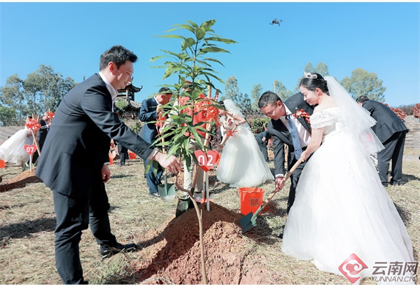在主儀式結束后,新人與現場來賓們共同前往觀音巖水電站營地植樹區,滿懷喜悅地栽種“同心林”,讓心愿與樹苗一起生根發芽。婚禮現場還組織了保護生物多樣性放流活動,11對新人一起放流了珍稀魚苗。