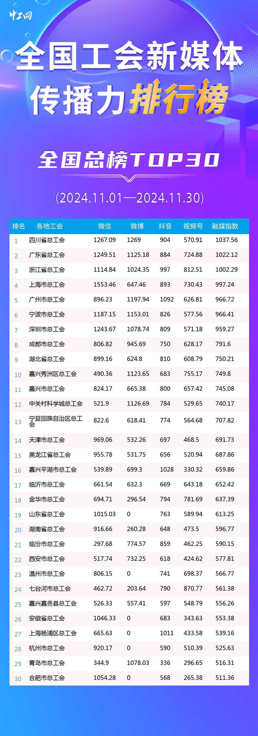 11月全國工會新媒體傳播力總榜TOP30發布:
