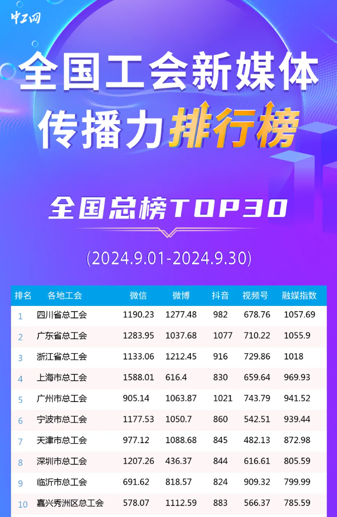 2024年9月全國工會新媒體傳播力總榜,四川省總工會名列榜首!