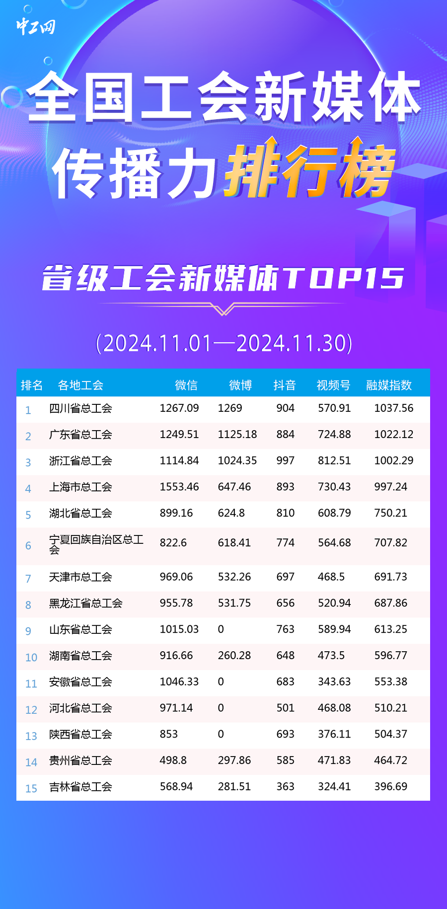 11月全國省級工會新媒體傳播力TOP15發(fā)布: