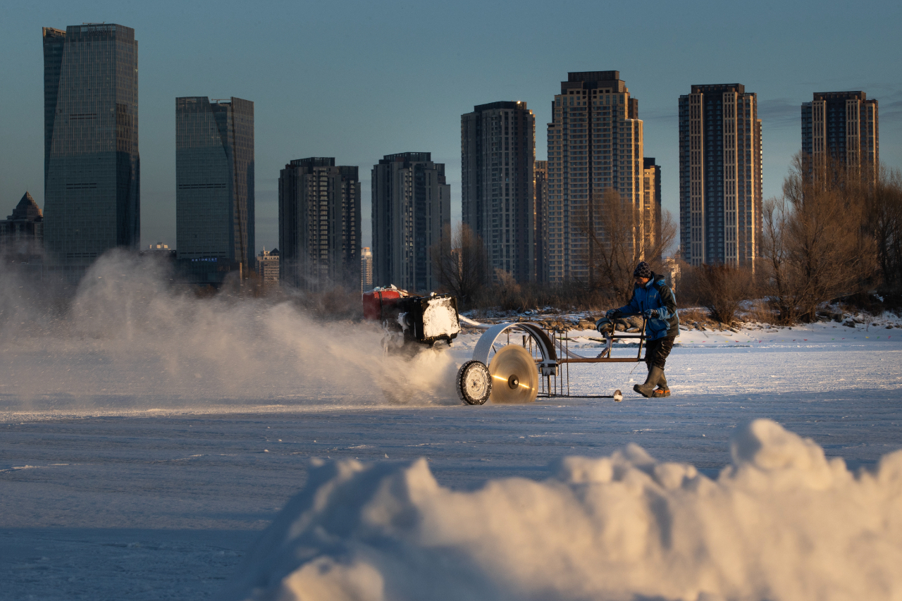 12月7日,在黑龍江哈爾濱松花江面,一名職業采冰人正在切割冰層。