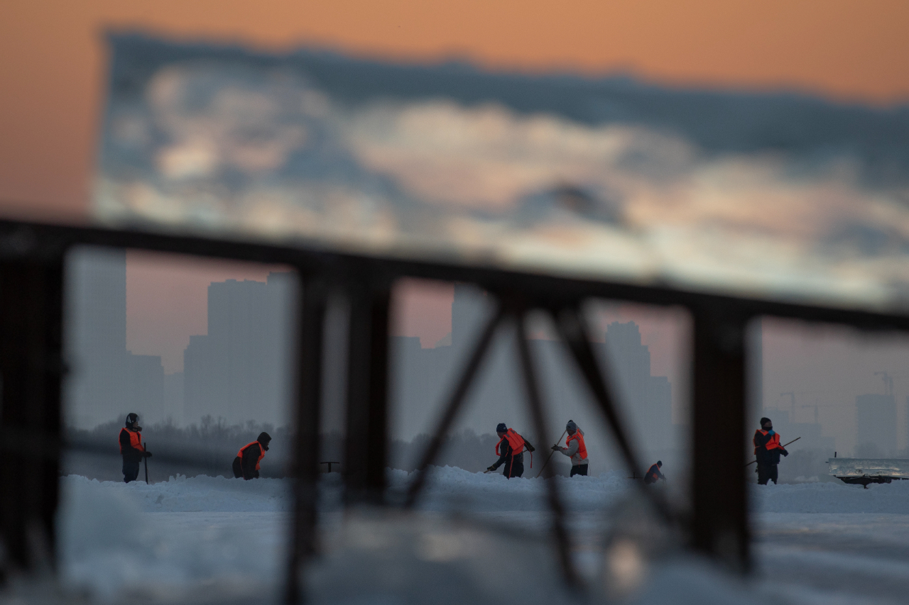 12月9日傍晚,黑龍江哈爾濱松花江面上的采冰人正在用叉車來回運送冰塊。