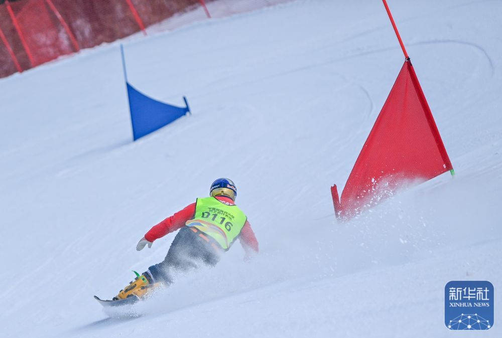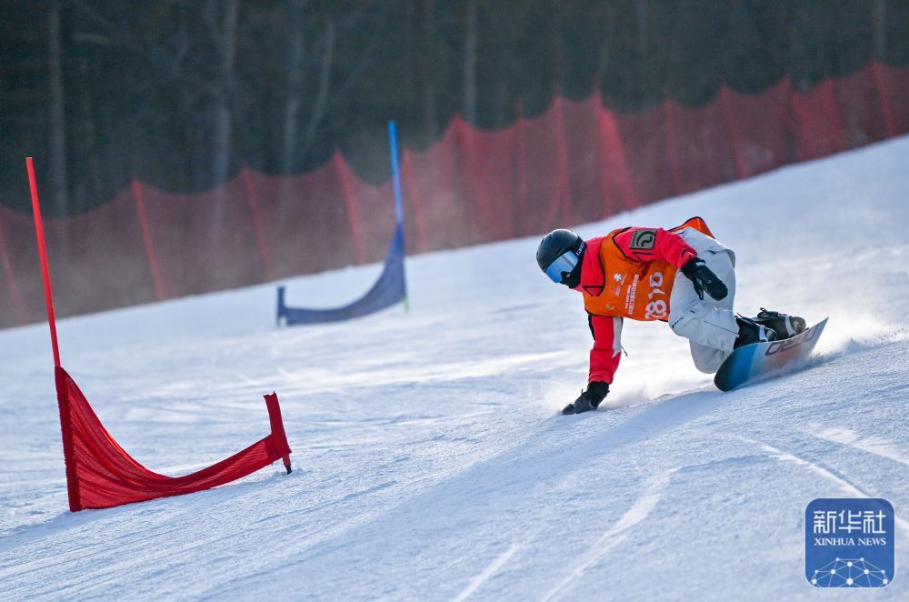 寧夏回族自治區總工會選手盛夢龍在單板滑雪男子平行大回轉項目比賽中。