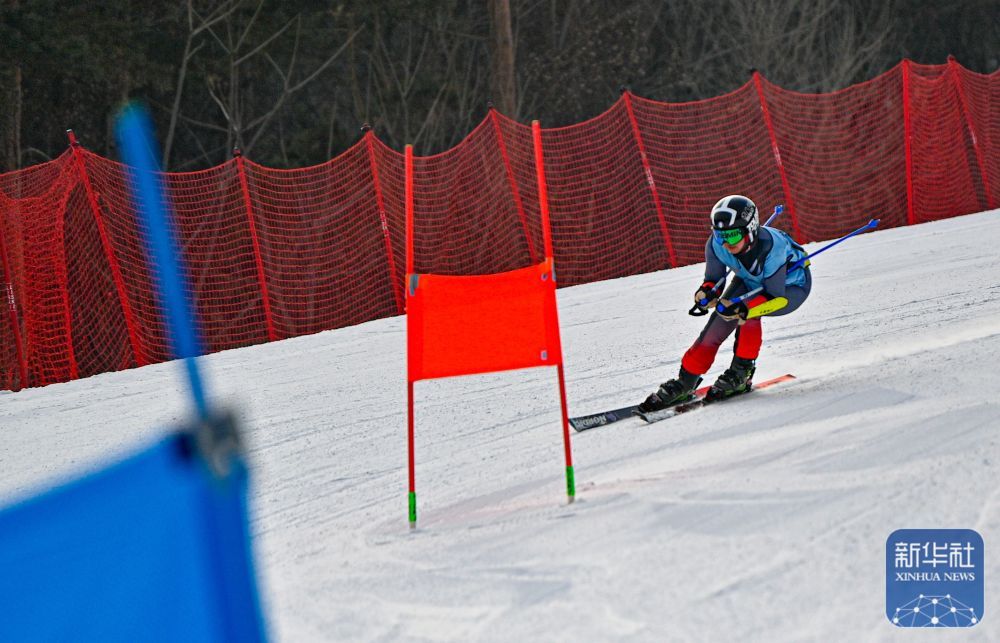 湖北省總工會選手鄒云在高山滑雪男子大回轉項目比賽中。