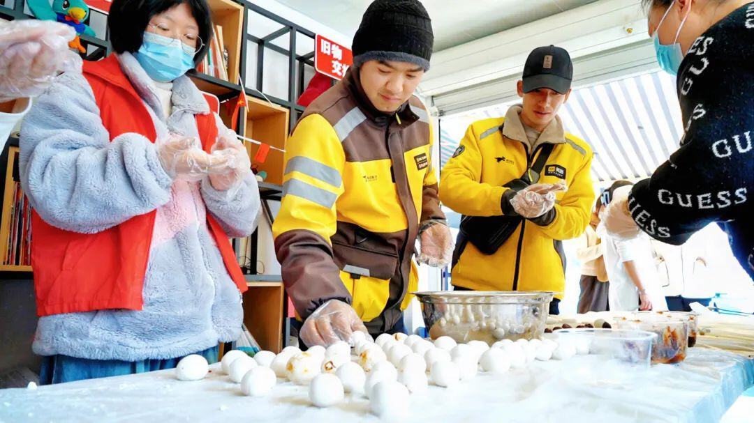 隨后大家在工會驛站煮起了餃子和湯圓。驛站一樓的“烹飪區”成為了最具人氣的地方,工作人員精心準備了黑芝麻、花生、豆沙、水果味等多種餡料的湯圓,熱氣騰騰的湯圓盛在碗中,伴隨著工作人員真摯的節日問候,遞到每一位新就業形態勞動者手中。貨車司機李師傅坐在餐桌前細細品嘗著碗中的湯圓,不自覺地點頭說道:“今年在驛站吃到的元宵節湯圓特別甜!”
