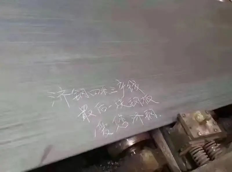 2017年3月,一塊刻著“濟鋼四米三產線,最后一塊鋼板,愛您濟鋼”的鐵板照片刷屏朋友圈。工人們用鋼釬在停產前最后一爐鐵水上刻下心聲。