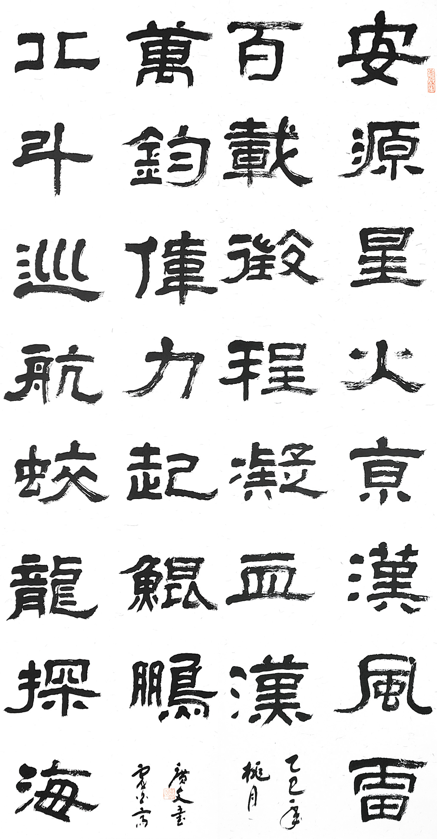 《安源星火京漢風雷百載征程凝血汗 北斗巡航蛟龍探海萬鈞偉力起鯤鵬》——隸書