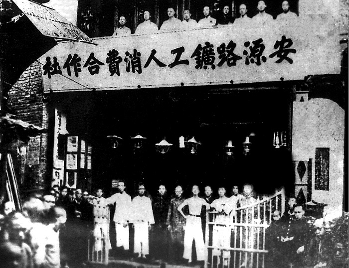 1922年7月,安源路礦工人消費合作社創辦,附設在工人補習學校內。圖為工人在安源路礦工人消費合作社門前合影。